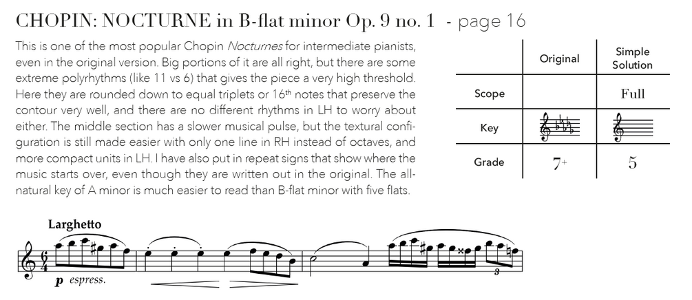 The whole volume comes in two versions: with arrangements both transposed to easier key signatures as well as kept in their the original keys. The "Easy Keys" transposed version is recommended for the most comfortable Simple Solutions experience. It's much easier to read notes without many sharps or flats, which frees up a lot of attention for all other musical aspects only at a cost if you have perfect pitch. The version in original key serves the purpose of constituting a proper stepping stone if you wish to continue with the full original later on, whithout having to unlearn all harmony because it was in the wrong key.