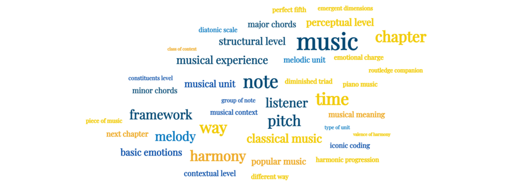 The core of the framework is a model of four levels of emergence that I present in chapter 5 and go through properly in chapters 6-12. Taken together they cover all sides of music, from the vibrations it can be reduced to, to the emotions we feel while listening, to the social situation of where we listen to it. It all comes together with the two key mechanisms of Emergence and Valence. When elements come together on one level and form units, those units attain a new set of properties on a secondary, emergent level. One such emergent property is the valence of meaning something to us as humans other than it is. A melody has a direction and wants to go somewhere. A harmonic progression has an emotional charge by the way it’s positioned within the system of tonality. The return of structural material means something, both in reference to itself only, and by way of convention. The intuitive understanding of all this valence is the very thing that is developed when we train to be musicians, or when we just play music.