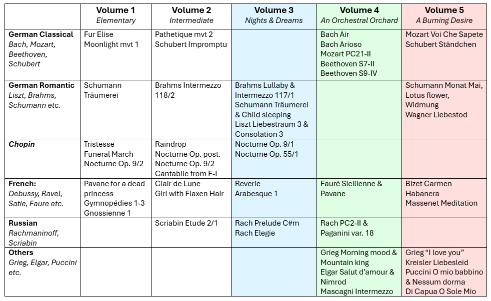 Volumes 1-3 contains all piano solo arrangements by Chopin, Beethoven, Debussy and more.
